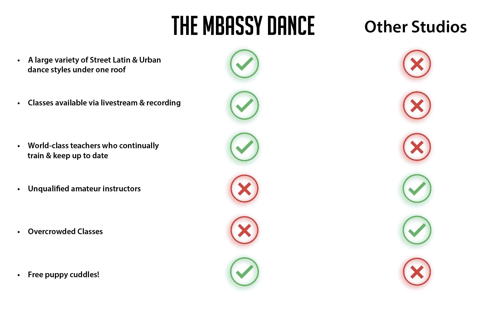 - Salsa - HipHop - Heels - Bachata - Reggaeton - Kpop - latin fusion - Twerk